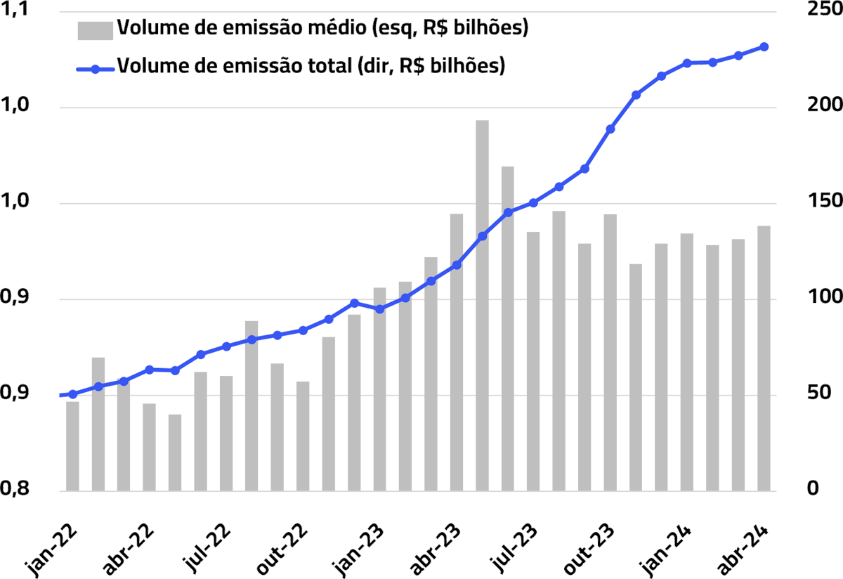 O volume de emissão médio da carteira está em R$ 932 milhões, com um volume de emissão total de R$ 232 bilhões.
