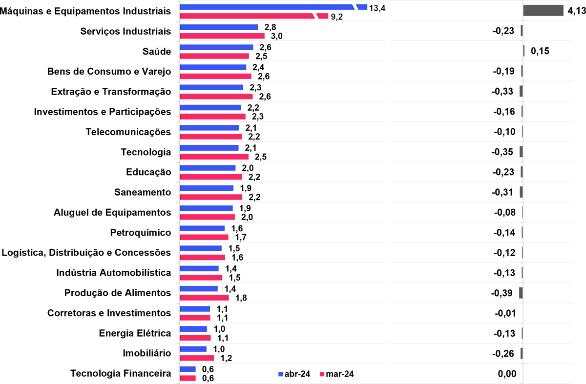 Spreads de carrego por setor (%) e variação entre abril e março