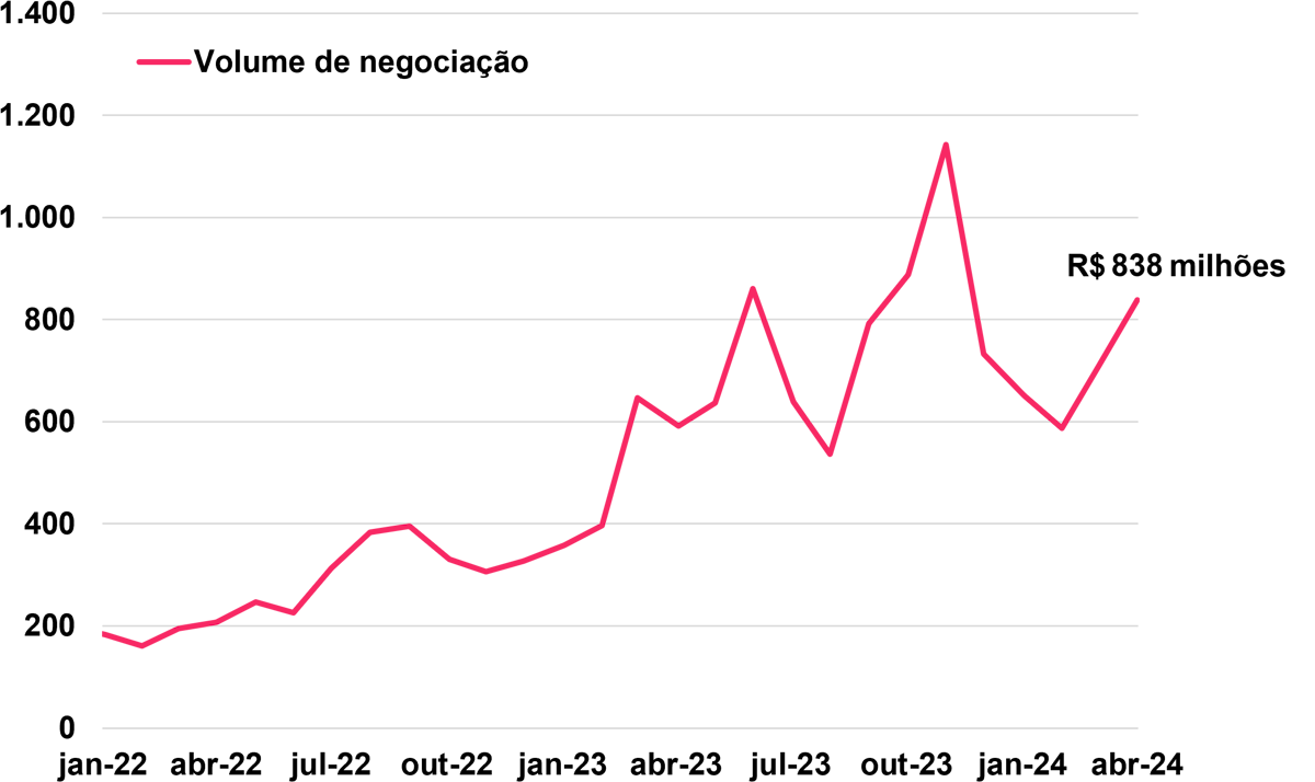 Em março, o valor de negociações médias por dia das debêntures no índice aumentou para R$ 838 milhões, dando continuidade ao crescimento do mês anterior.