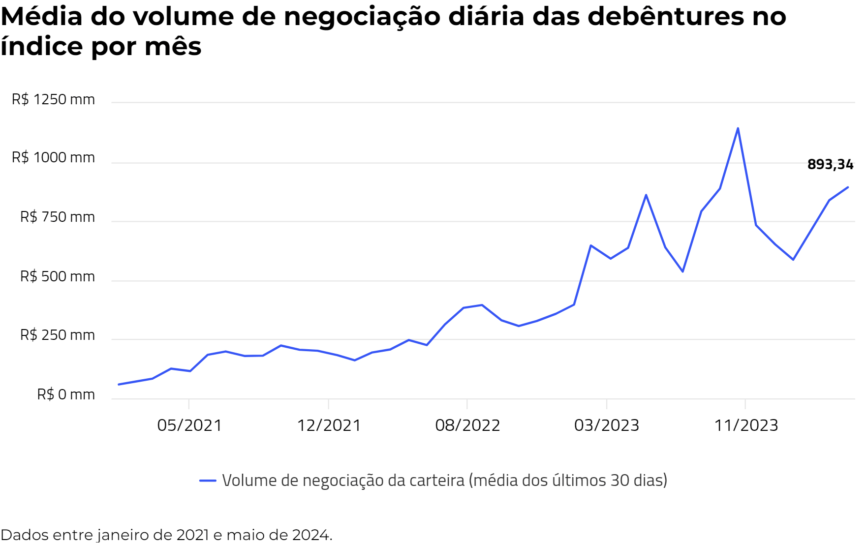 Em abril, o valor de negociações médias por dia das debêntures no índice aumentou para R$ 893 milhões, dando continuidade ao crescimento do mês anterior.