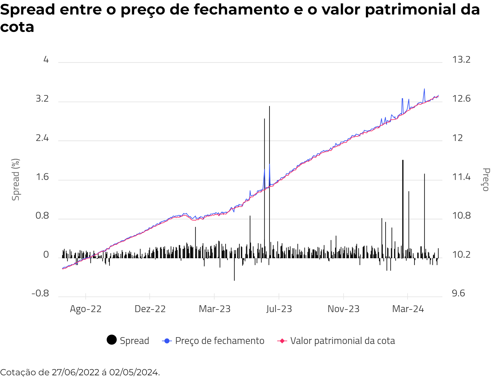 No mês de abril, o spread médio foi de 0,12%, calculado entre o preço de fechamento e o valor patrimonial. O ETF DEBB11 oferece spreads de negociação baixos, proporcionando uma experiência de investimento mais acessível e eficiente, sem os desafios comuns associados às negociações no mercado de balcão.
