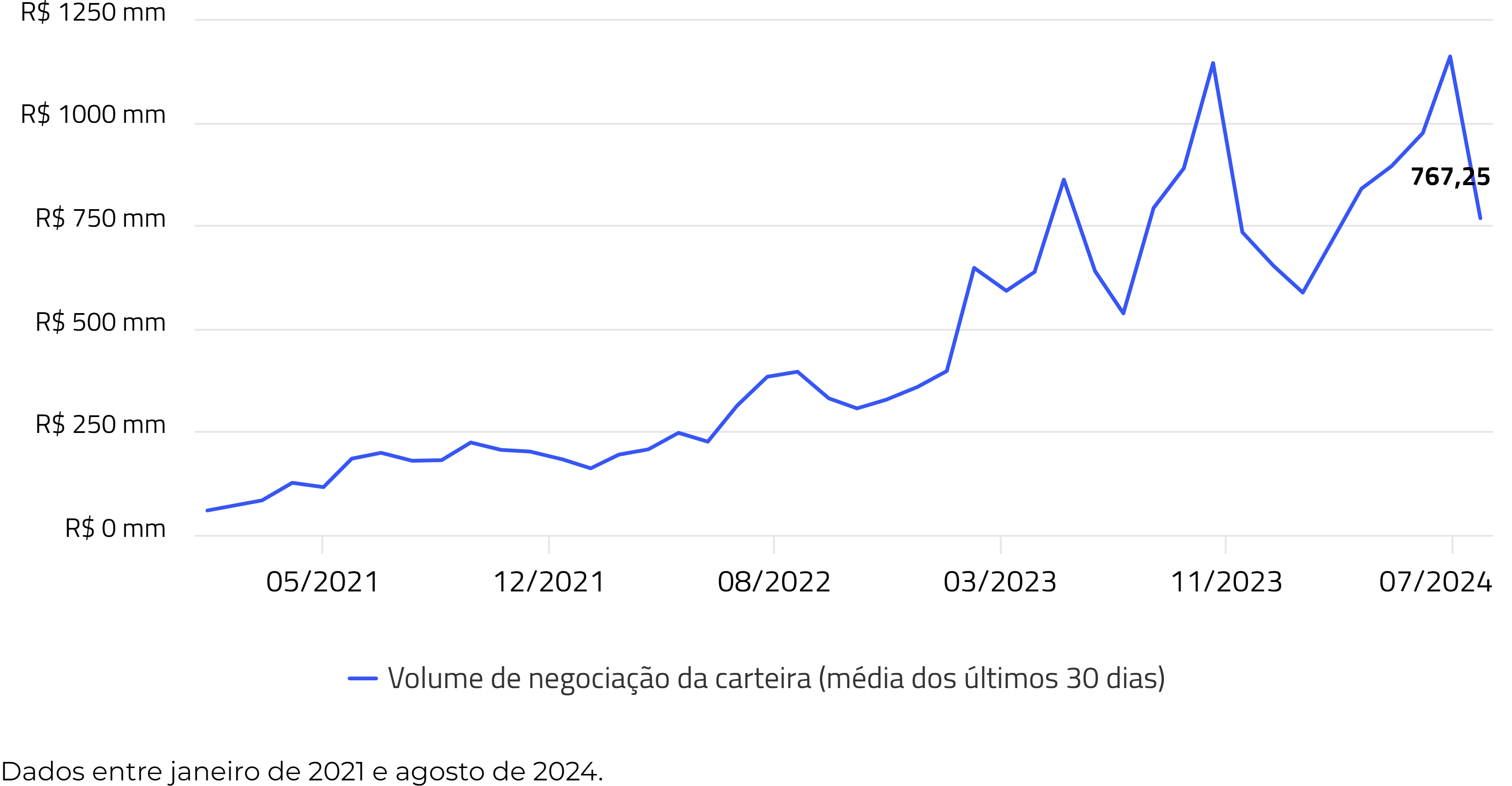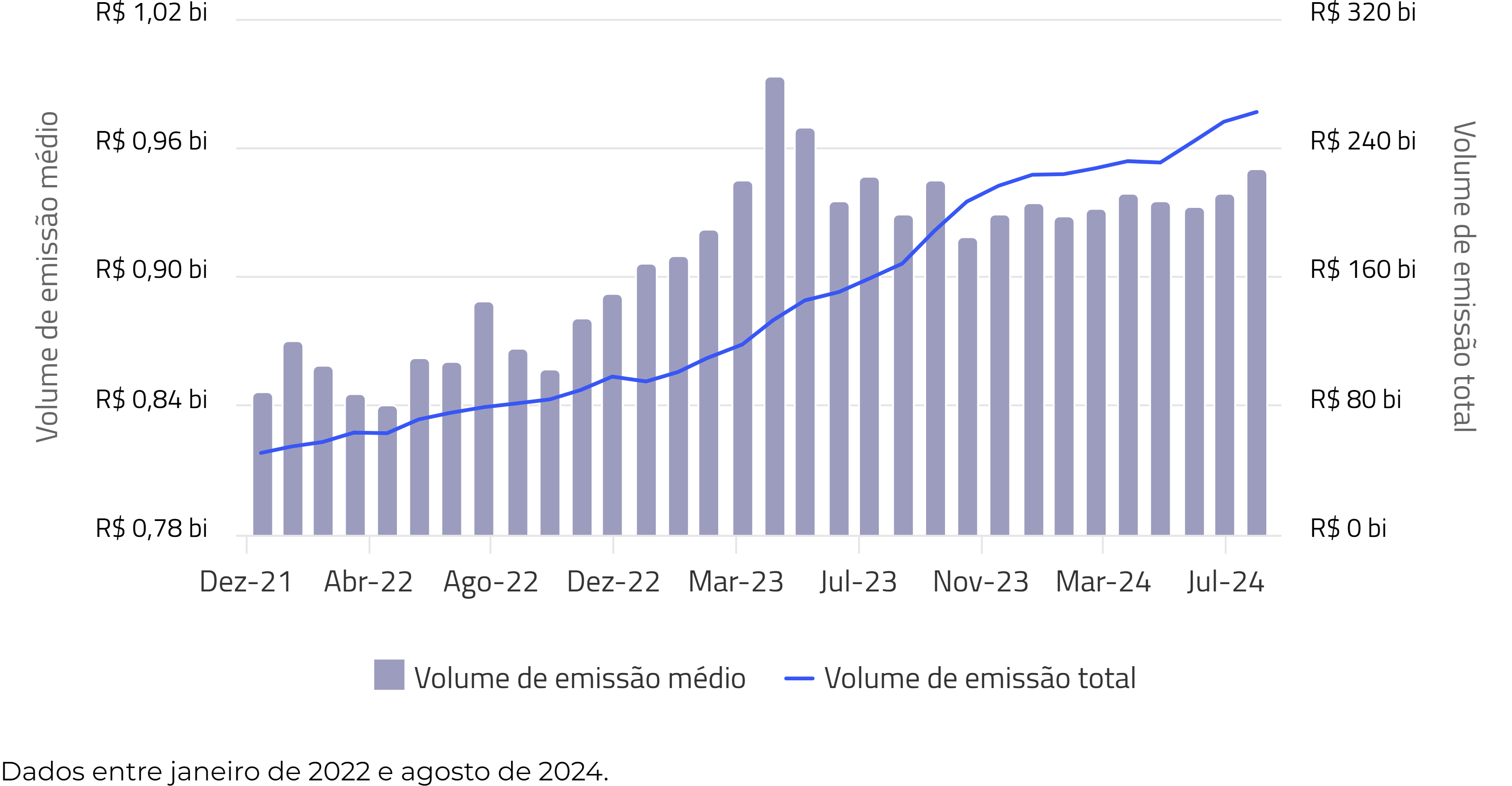 O volume de emissão médio da carteira está em R$ 950 milhões, com um volume de emissão total de R$ 262 bilhões.
