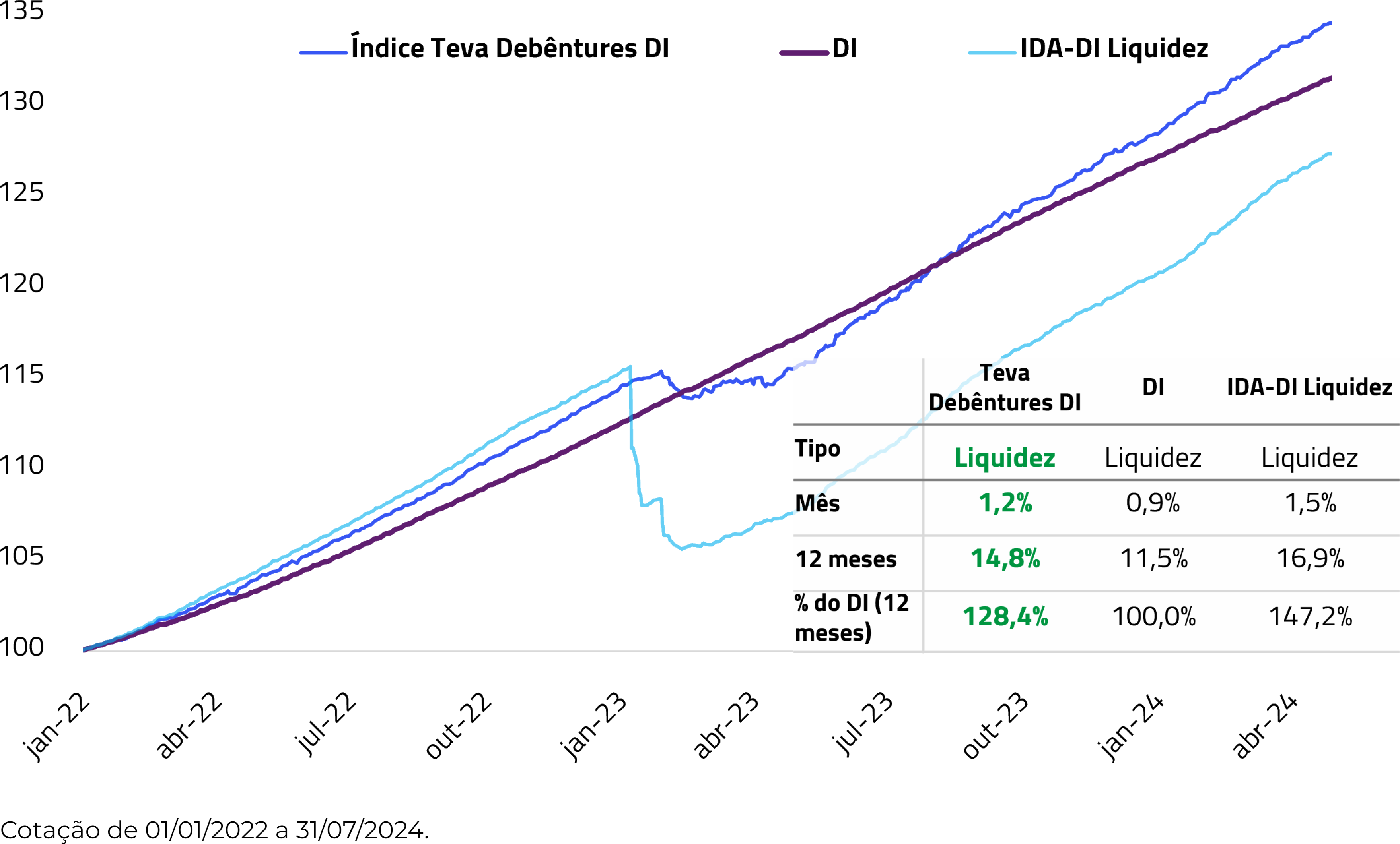 Em julho, o Índice Teva Debêntures DI teve um desempenho de 1,2%, performando 127,8% do DI esse mês e 128,4% do DI esse ano.