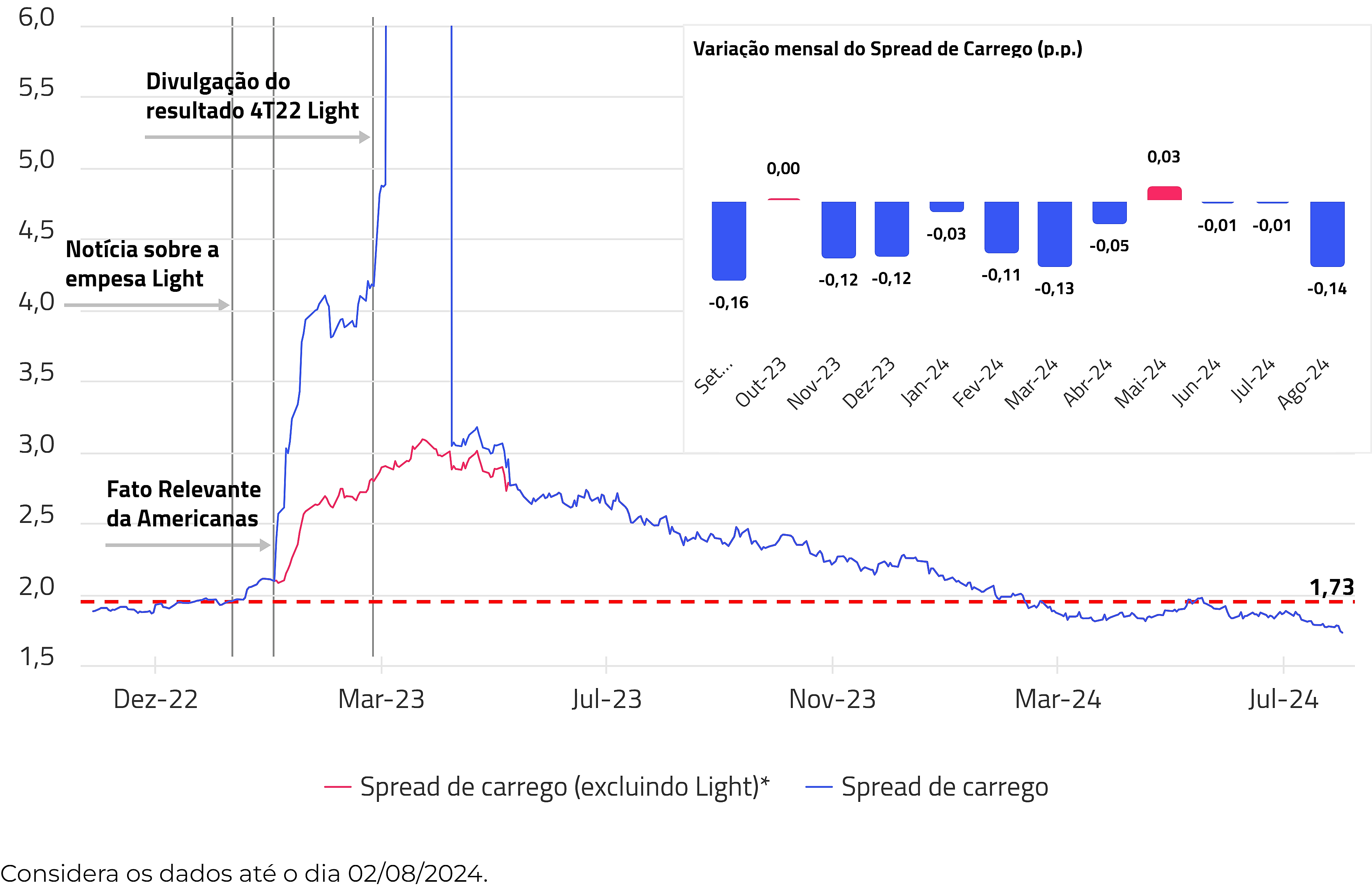 No fechamento de julho, o spread de carrego foi registrado em DI + 1,73%, representando uma diferença de -0,14%, em relação ao valor do fechamento de junho, que era de DI + 1,87%. Desde o início de 2024 até o final de julho, o spread decresceu 0,41% em valores absolutos. Apesar do aumento de spread durante o mês de maio de 2024, as quedas têm sido mais frequentes, contribuindo para que o spread esteja abaixo do valor pré-evento da Americanas.