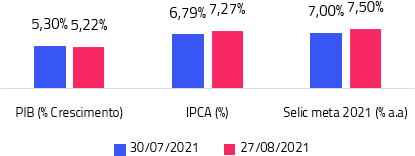 De acordo com os dados publicados no boletim Focus¹, a previsão de crescimento retraiu 0,08 p.p desde o início do mês e a expectativa de inflação saltou 0,48 p.p.