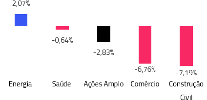 - Apesar disso, os setores de saúde e energia foram bastante resilientes e terminaram o mês com desempenho superior ao mercado. Os índices setoriais de Ações Energia e Ações Saúde, calculados pela Teva, renderam 2,07% e -0,64%, respectivamente.