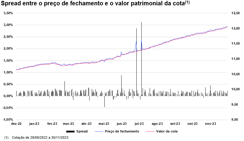 Uma das grandes vantagens do ETF DEBB11 é que ele permite que o investidor negocie uma carteira diversificada de debêntures com spreads baixos. Em novembro a média do spread foi de 0,17% entre o preço de fechamento e o valor patrimonial, mesmo dos últimos 12 meses.