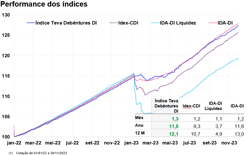 Destaca-se que, no mês de novembro, o Índice Teva Debêntures DI registrou um desempenho superior em comparação a seus pares, apresentando uma valorização de 1,3% e um retorno de 144% do DI no mesmo período. Nos últimos 6 meses, o índice acumulou uma valorização de 10,2% contra uma valorização de 6,3% do DI.