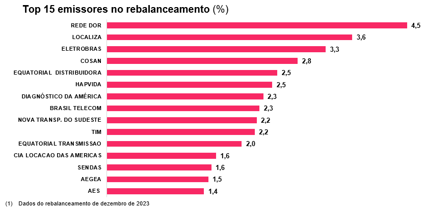 A composição da carteira do Índice Teva Debêntures DI no mês de dezembro inclui 233 debêntures emitidas por 132 emissores, com uma duration de 2,6 anos. No último rebalanceamento, oito novas debêntures foram incorporadas à carteira.