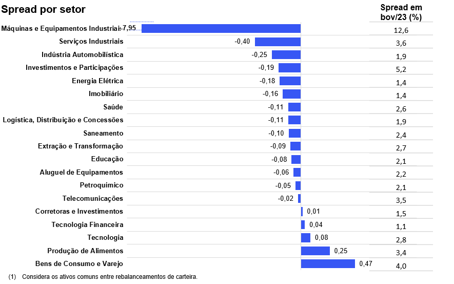 Enquanto isso, o setor de Bens de Consumo e Varejo permaneceu com a maior abertura, com um aumento de 0,47% no prêmio de risco, alcançando o top 3 dos maiores spreads de carrego, atrás de Máquinas e Equipamentos e investimentos e participações, este último com spread de 5,2%.