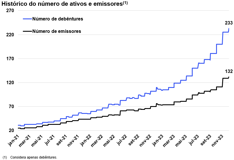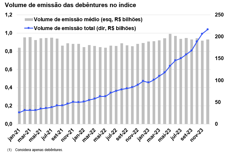 Em novembro houve 12 novas emissões de debêntures indexadas ao DI, totalizando R$11 bi de volume financeiro.