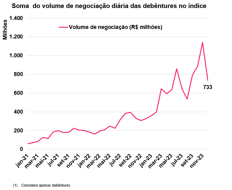 Em novembro o valor de negociações médias por dia das debêntures no índice foi de R$733 milhões, uma queda de 46% após recorde de outubro, mas segue em patamares elevados.