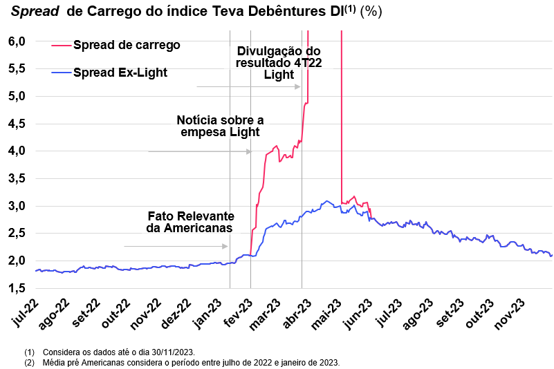 O spread de carrego do Índice Teva Debêntures DI apresentou uma queda de 0,86%, alcançando 77% dos ativos. Ao encerrar o mês de novembro, o spread de carrego registrado foi de DI + 2,19%, próximo ao valor pré evento da Americanas onde o spread era de 2,10%, indicando sinais positivos de recuperação no mercado de crédito.