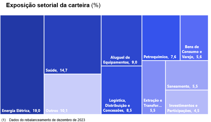 Os ativos estão distribuídos em 20 setores econômicos, proporcionando uma cobertura significativa do mercado.