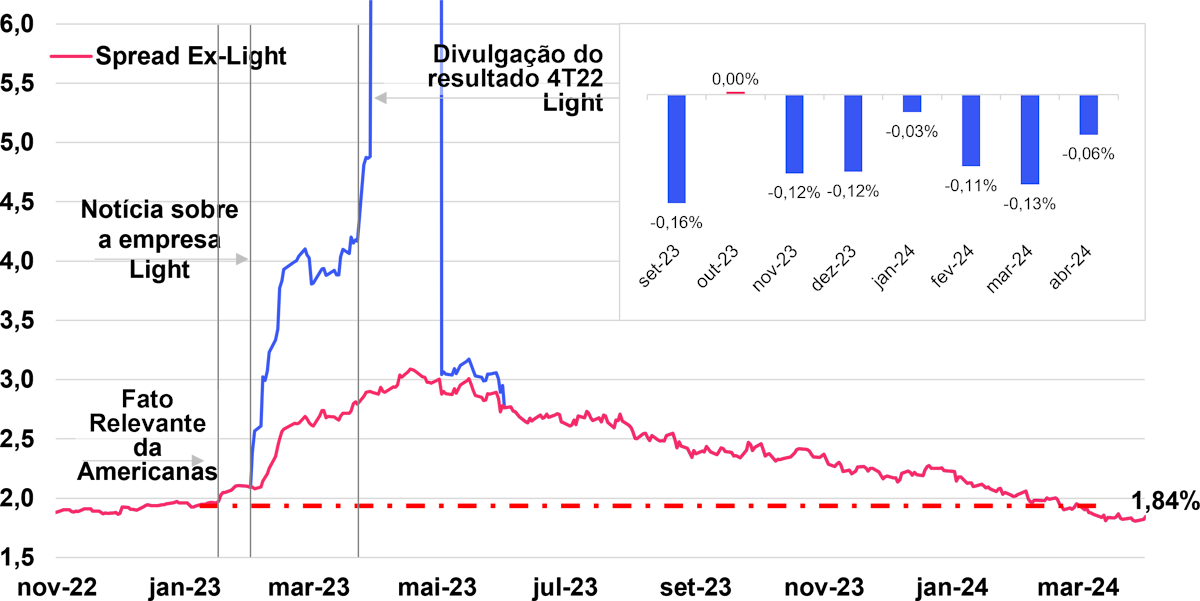 Considera a composição da carteira do rebalanceamento de março para comparação de spreads entre 04/03/2024 e 01/04/2024.