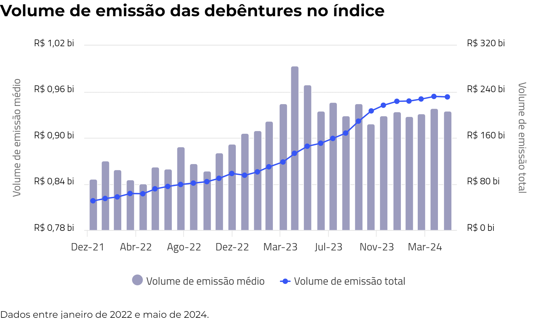 O volume de emissão médio da carteira está em R$ 935 milhões, com um volume de emissão total de R$ 231 bilhões.