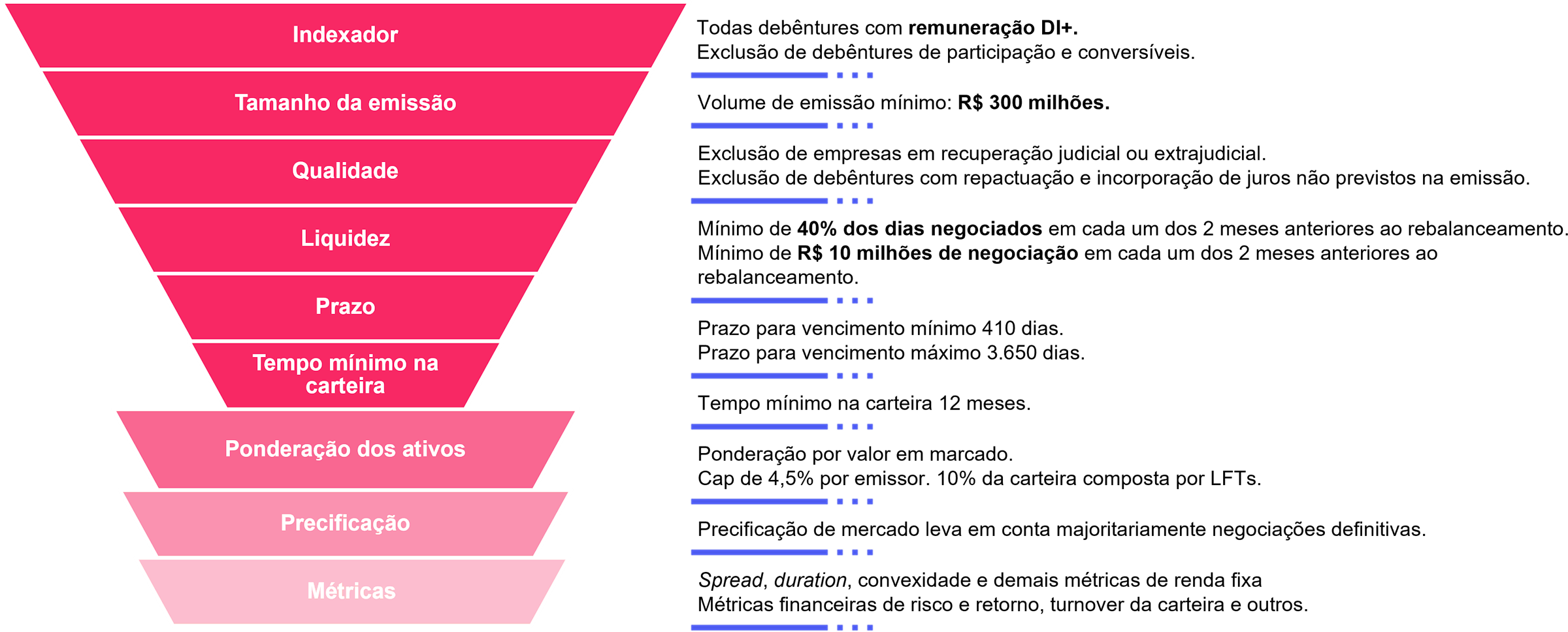 Essa abordagem estratégica não apenas fortalece a resistência da carteira diante de flutuações específicas do mercado, mas também oferece aos investidores uma maneira mais equilibrada e prudente de acessar o segmento de debêntures.