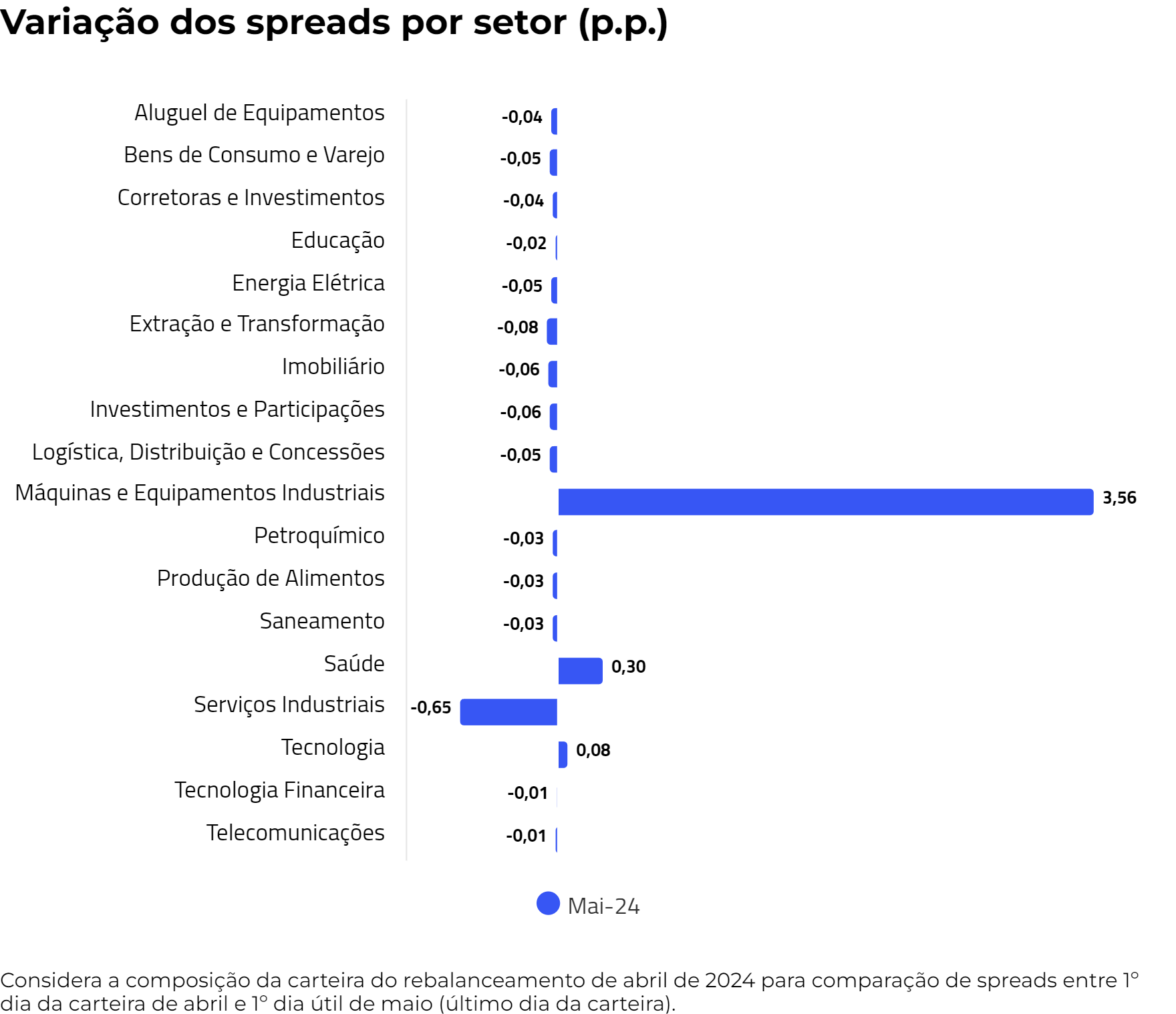 Cabe destacar que uma queda dos spreads dos ativos está ligada a uma diminuição no preço do ativo e a um acréscimo no retorno esperado. Esse padrão evidencia diversos aspectos, sendo o principal deles um aumento no prêmio de risco, indicativo de que os investidores estão percebendo um ambiente mais arriscado. Ao se analisar de forma separada por setor, é possível avaliar a confiança do mercado em cada área específica diante do cenário econômico atual.