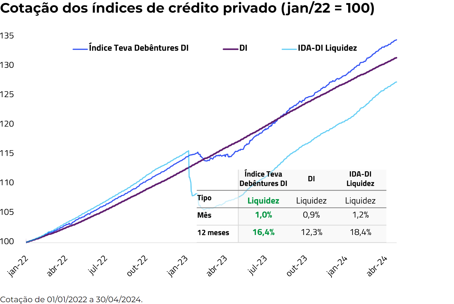 Em abril, o Índice Teva Debêntures DI teve um desempenho de 1,0%, performando 108,1% do DI esse mês e 136,0% do DI esse ano.