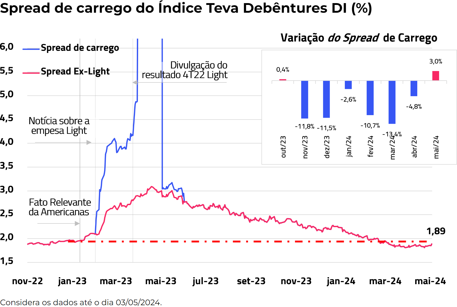 No fechamento de abril, o spread de carrego foi de DI + 1,89%, representando um pequeno aumento de 0,03 p.p. em relação ao valor do fechamento de março, que era de 1,86%. Ao longo do ano, o spread decresceu 0,26 p.p., sinalizando uma continuidade na trajetória de recuperação do setor de crédito privado.